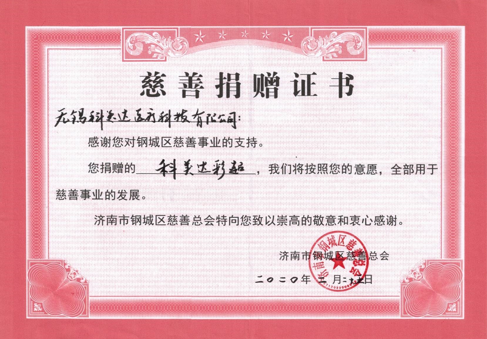 庚子年初,新冠肺炎疫情洶涌而來,隨著鐘南山院士馳援武漢指出新冠肺炎存在“人傳人”的現象,一場史無前例的疫情攻堅戰在全國打響。武漢告急,全國馳援,從生活物資到醫療用品源源不斷往最需要的地方,山東人民搬家式的支援抗疫模式更是感動了全國人民,彩超作為新冠肺炎病情診斷的重要手段,得到臨床專家的重視,為緩解疫情防控期間醫療物資緊缺狀況,有效防范醫護人員感染和疫情擴散風險,科美達公司主動聯系山東省慈善機構,向濟南市鋼城區慈善總會定向捐贈了價值38萬元的便攜式彩超設備,用于濟南市鋼城區醫院抗擊肺炎疫情和人民健康檢查,確保戰略后方穩固。